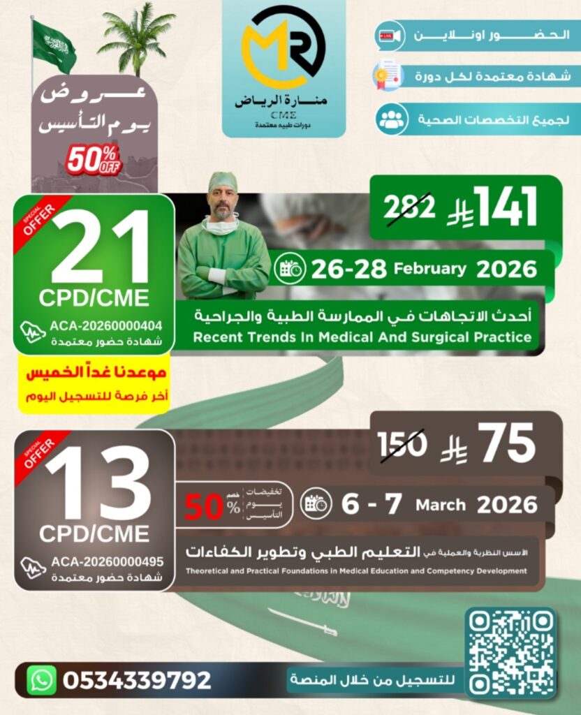 الصفحة الرئيسية Rated 5 out of 5 منــارة الــريـاض . للدورات الطبية استثمر في تطويرك المهني بواسطة دورات طبية معتمدة تتميز بالجودة والمصداقية ، والتي تلبي احتياجاتك واهتماماتك المهنية للممارسين الصحيين والطلاب تواصل معنا عروض يوم التأسيس فـرصة مميزة بـ 34 ســاعة CME معتمـدة بخصم 50% ثلاث دورات متتاليتينيجب التسجيل بالثلاث دورات بالرابط بلاسفل للحصورة علي 34 ساعة للتسجيل في اي دورة من خلال الروابط التالية لجميع المجالات الطبية وفر 50% 141 ر.س 282 ر.س سجل الأن لجميع المجالات الطبية وفر 50% 75 ر.س 150 ر.س سجل الأن دورات متنوعة موثقة من الهيئة نقدم دورات في مختلف مجالات القطاع الصحي للمساهمة الفعالة في تطوير المجتمع الصحي من أطباء وممارسين وطلاب . ساعات وشهادات معتمدة من الهيئة السعودية للتخصصات ساعات تعليم طبي مستمر تضاف الى ممارس بلس بالإضافة إلى شهادات لكل دورة بعد إتمام الدورات . آراء العملاء عبيد العنزي ☆ ☆ ☆ ☆ ☆ الاهتمام بالرد علي العملاء وتوضيح تفاصيل وكيفية الاشتراك اهم ما يميزهم، موفقين بإذن الله منذ 10 ايام اميرة الشهري ☆ ☆ ☆ ☆ ☆ دورات متنوعة التخصصات ما شاء الله قبل شهر دكتورة ايمان علي ☆ ☆ ☆ ☆ ☆ اشتركت معهم بكثير من الفعاليات، تنظيم ومتابعة بدقة عالية قبل شهرين علي الشهراني ☆ ☆ ☆ ☆ ☆ نتمني عمل ورش عمل للكوتشنج و المدرب الصحي، يعطيكم العافية قبل ثلاثة أشهر الزائرون 0